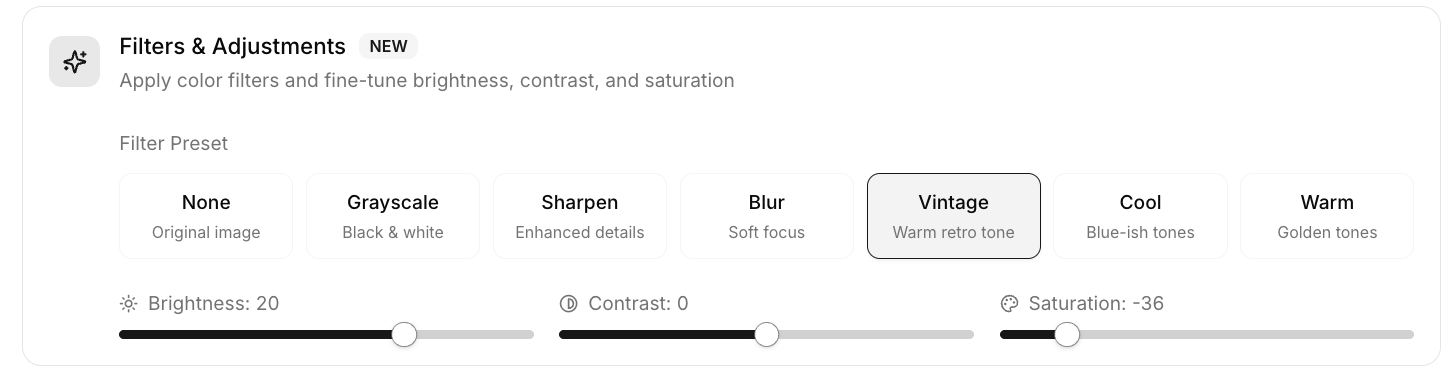 - Saturation (-50 to +50): Boost or reduce color intensity