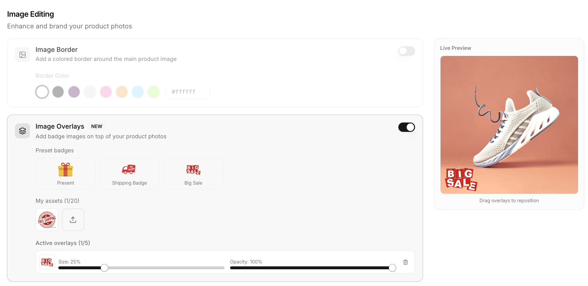 Overlays are badge images that get composited on top of your product photo. Common uses include "Free Shipping" badges, "Sale" banners, or your store logo.